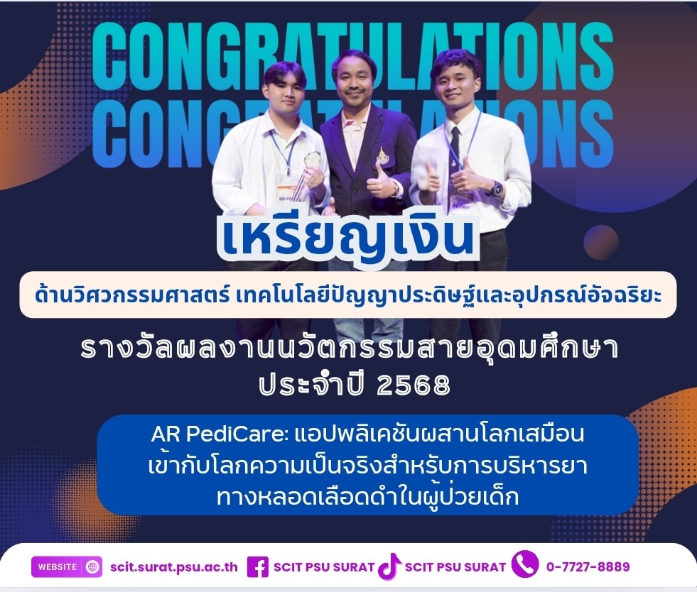 ขอแสดงความยินดีกับผลงานนักศึกษาได้รับรางวัลเหรียญเงิน กลุ่ม 3 ด้านวิศวกรรมศาสตร์ เทคโนโลยีปัญญาประดิษฐ์และอุปกรณ์อัจฉริยะ
